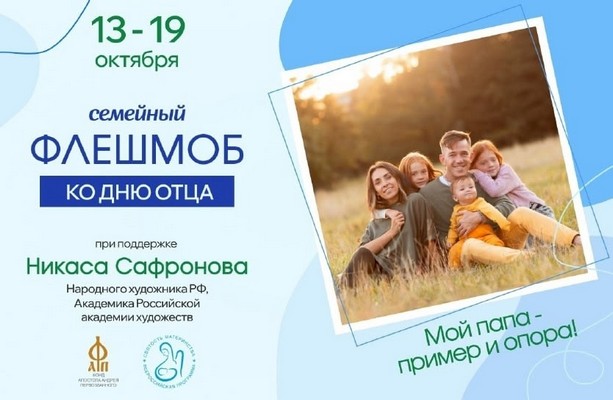 Объявлен Всероссийский семейный флешмоб «Мой папа-пример и опора», приуроченный к празднику «День отца» (19 октября 2025г). Фонд Андрея Первозванного проводит флешмоб при поддержке народного художника Российской Федерации, Академика Российской академии художеств, профессора кафедры рисунка и живописи Российского государственного университета им.А.Н. Косыгина, декана факультета культуры и искусства Ульяновского государственного университета Никаса Сафронова.